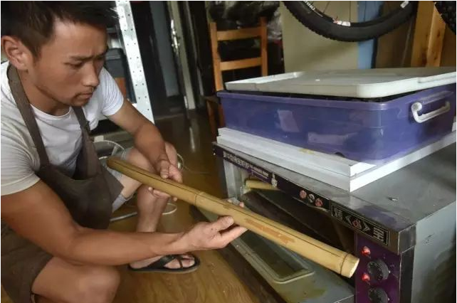 第二步就是要对竹子进行防裂防霉防虫处理,竹子经过烤箱100到150摄氏度的烘烤,这样处理后可以有效达到防霉防虫效果,还能将有裂缝的竹子剔除。出烤箱后再抹上一层油,让竹子变得更加结实,足以承受一个成人的体重,强度甚至可以跟钢管媲美。