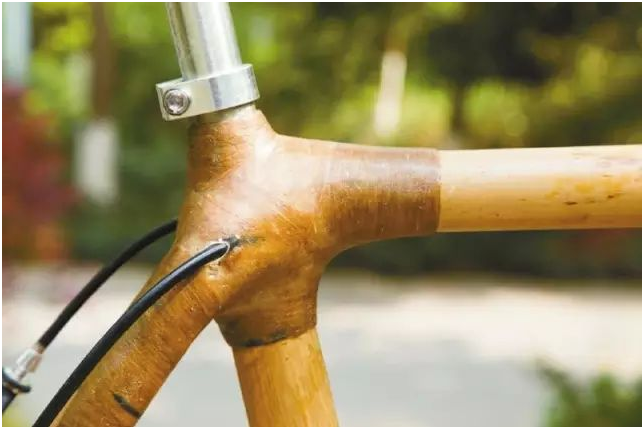 竹子车梁在夹具上组合好后,用亚麻和碳纤维结合环氧树脂将接口位置胶粘。然后将胶粘的位置用工具进行打磨。