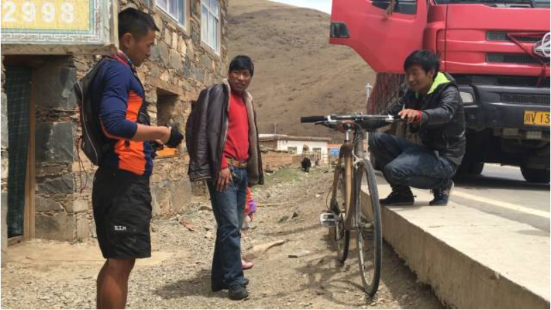 ▲试骑竹子单车的藏民们 5月3日,阿布从成都出发。