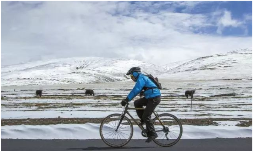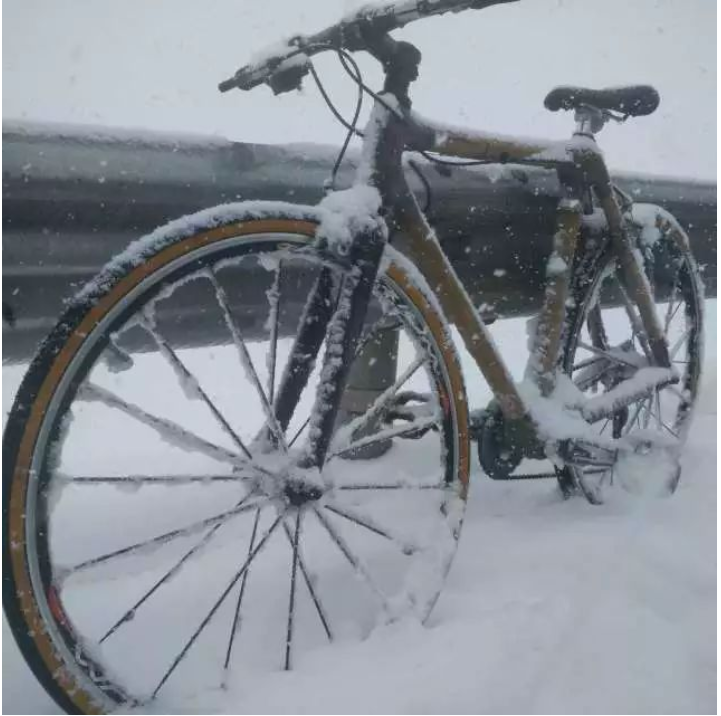 ▲在拉萨的路上,车被冻住了 穿越可可西里无人区, 也曾遭遇暴风雪将刹车冻住、 车身被冰封, 在这些严酷的考验下, 竹子自行车仅车身出现了一条裂纹。